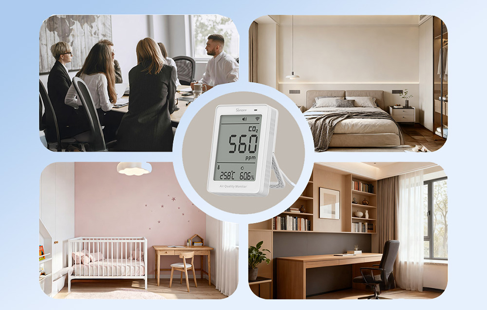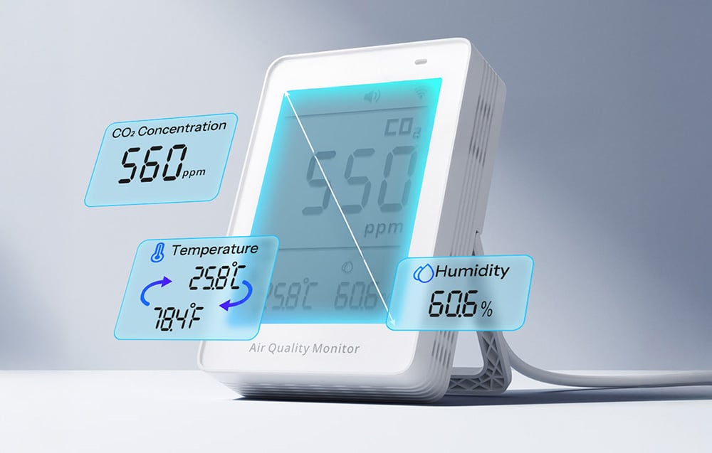 Dispozitivul monitorizează nu numai nivelurile de CO₂, ci și temperatura în intervalul 0–50 °C cu o precizie de ±0,5 °C și umiditatea de la 5 la 95% RH cu o precizie de ±3%. Acest lucru vă oferă o imagine completă a condițiilor din cameră într-un singur loc. Este o soluție practică care ajută la menținerea unui mediu confortabil în dormitor, sufragerie, birou și camera copiilor.