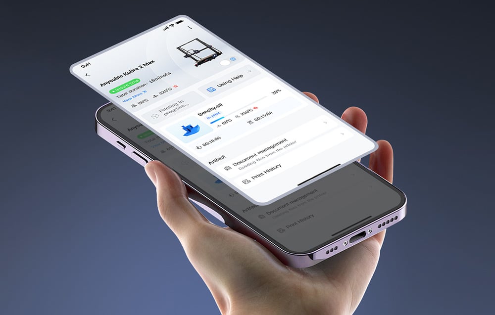 Imprimanta funcționează cu o aplicație Anycubic dedicată, cu care puteți, printre altele, să verificați starea acesteia în timp real și să actualizați software-ul. Kobra 2 Max este, de asemenea, echipată cu un ecran tactil color de 4,3 inci, care vă permite să ajustați convenabil setările și multe altele.