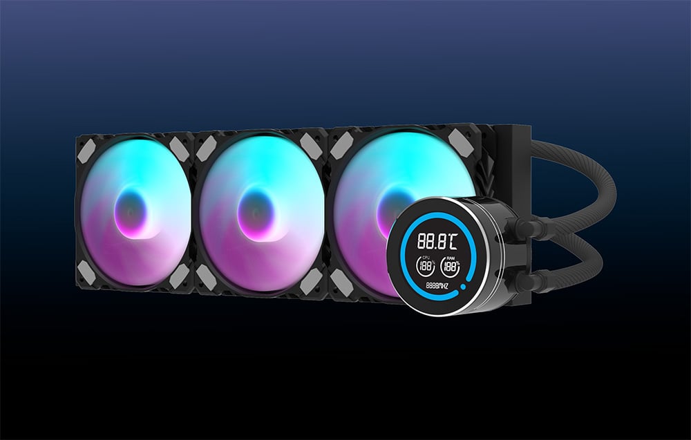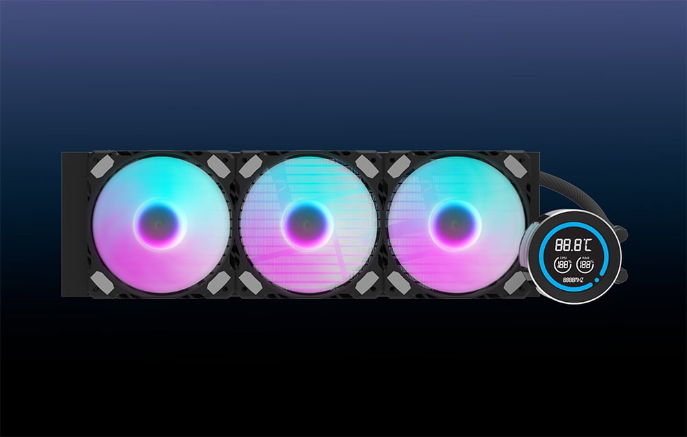 Sistemul de răcire Darkflash DN-D360 dispune de trei ventilatoare de 120 mm de înaltă performanță cu funcție PWM, care își reglează automat viteza de la 800 la 1.800 RPM în funcție de sarcina procesorului. Ventilatoarele utilizează rulmenți hidraulici, extinzându-le durata de viață la 40.000 de ore și oferind o funcționare silențioasă cu un flux de aer maxim de 61,7 CFM. Retroiluminarea ARGB vă permite să sincronizați culorile și efectele vizuale cu alte componente.