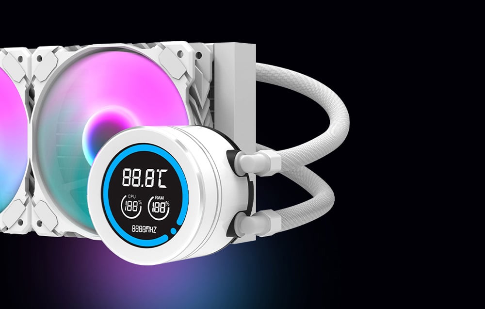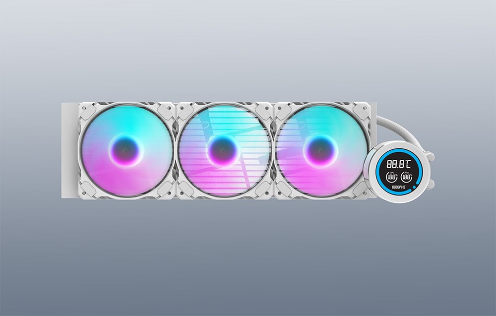 Sistemul de răcire Darkflash DN-D360 dispune de trei ventilatoare de 120 mm de înaltă performanță cu funcție PWM, care își reglează automat viteza de la 800 la 1.800 RPM în funcție de sarcina procesorului. Ventilatoarele utilizează rulmenți hidraulici, extinzându-le durata de viață la 40.000 de ore și oferind o funcționare silențioasă cu un flux de aer maxim de 61,7 CFM. Retroiluminarea ARGB vă permite să sincronizați culorile și efectele vizuale cu alte componente.